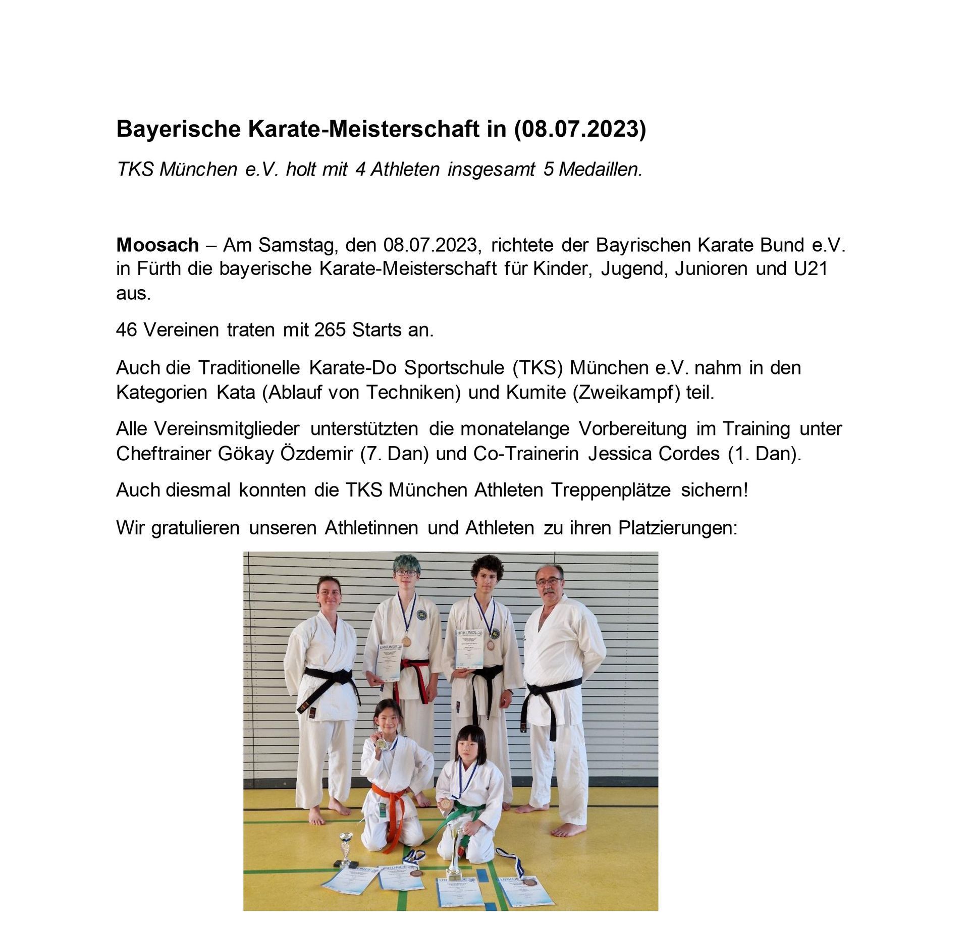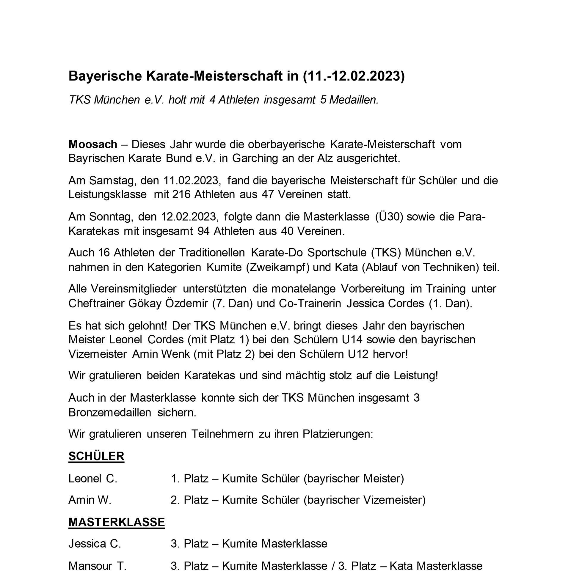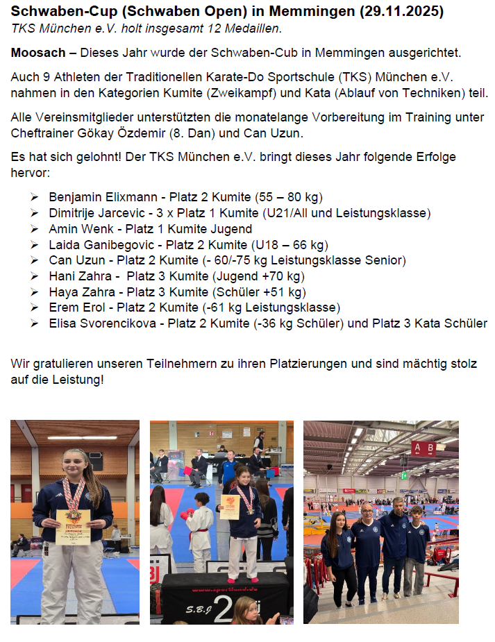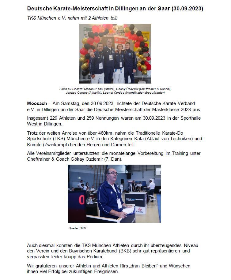 Dieses Jahr fand die Bayerische Karate- Meisterschaft für Kinder, Schüler, Master und Paraklasse mit 466 Athleten aus 64 Vereinen statt. Die Traditionellen Karate-Do Sportschule (TKS) München e.V. nahm mit 8 Athleten in den Kategorien Kumite (Zweikampf) und Kata (Ablauf von Techniken) teil.