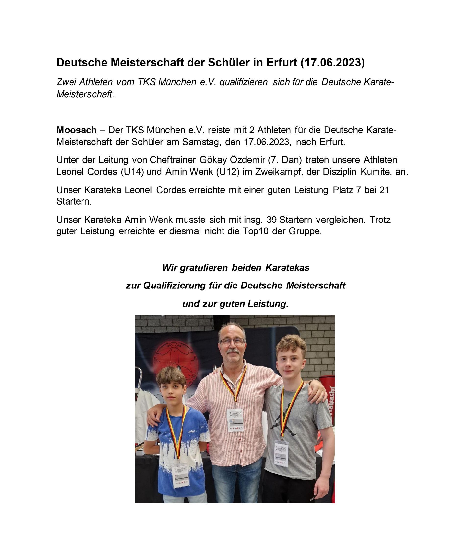 - Can Uzun zum 1. Platz Kumite -60 kg/-67 kg U21 Männlich, 3. Platz Kumite -60 kg/ -67 kg Leistungsklasse