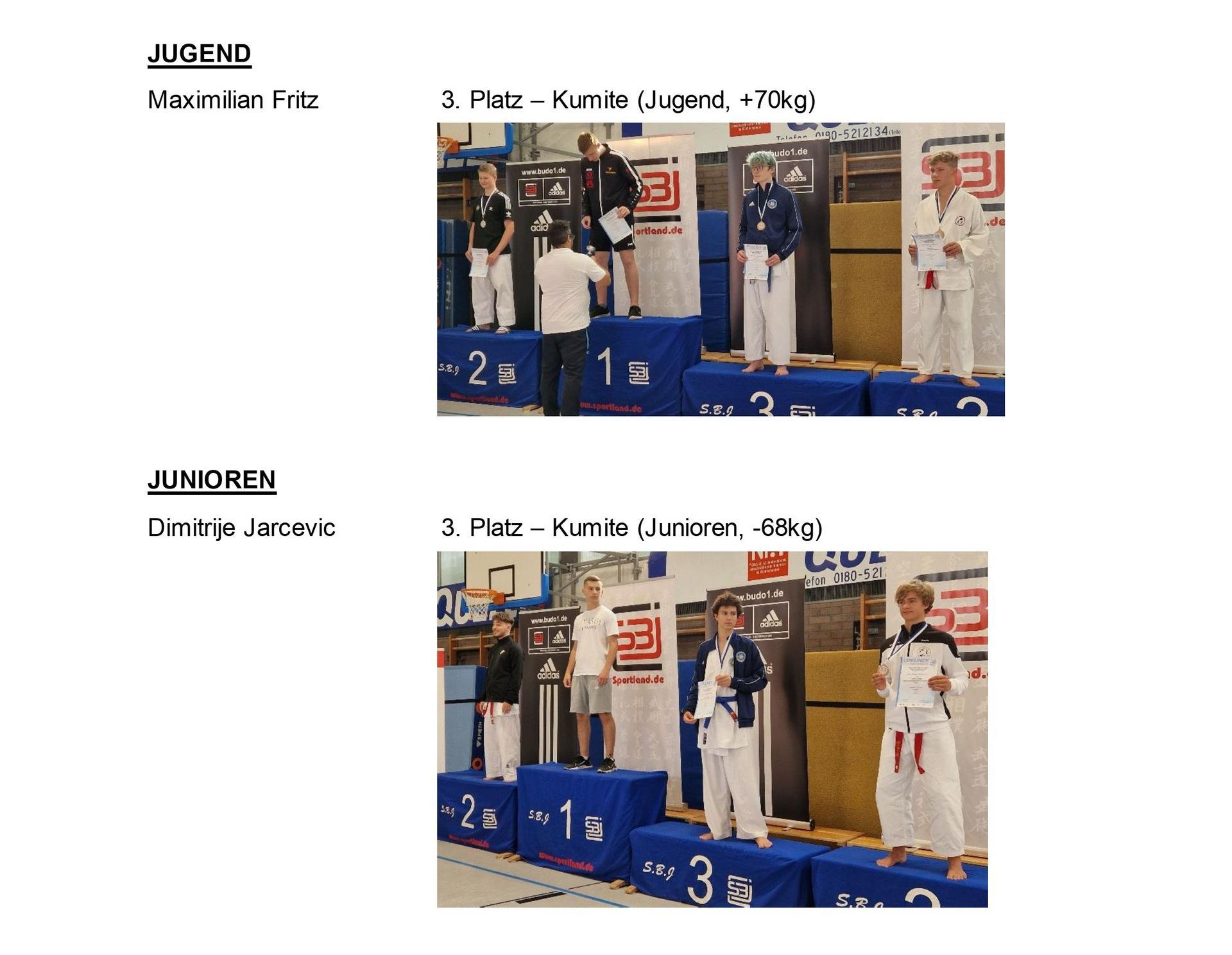 - Dimitrije Jarcevic zum 2. Platz Kumite -76 kg/ +76 kg Junioren Männlich, 1. Platz Kumite Allk. Junioren Männlich, 2. Platz Kumite Mannschaft Junioren
